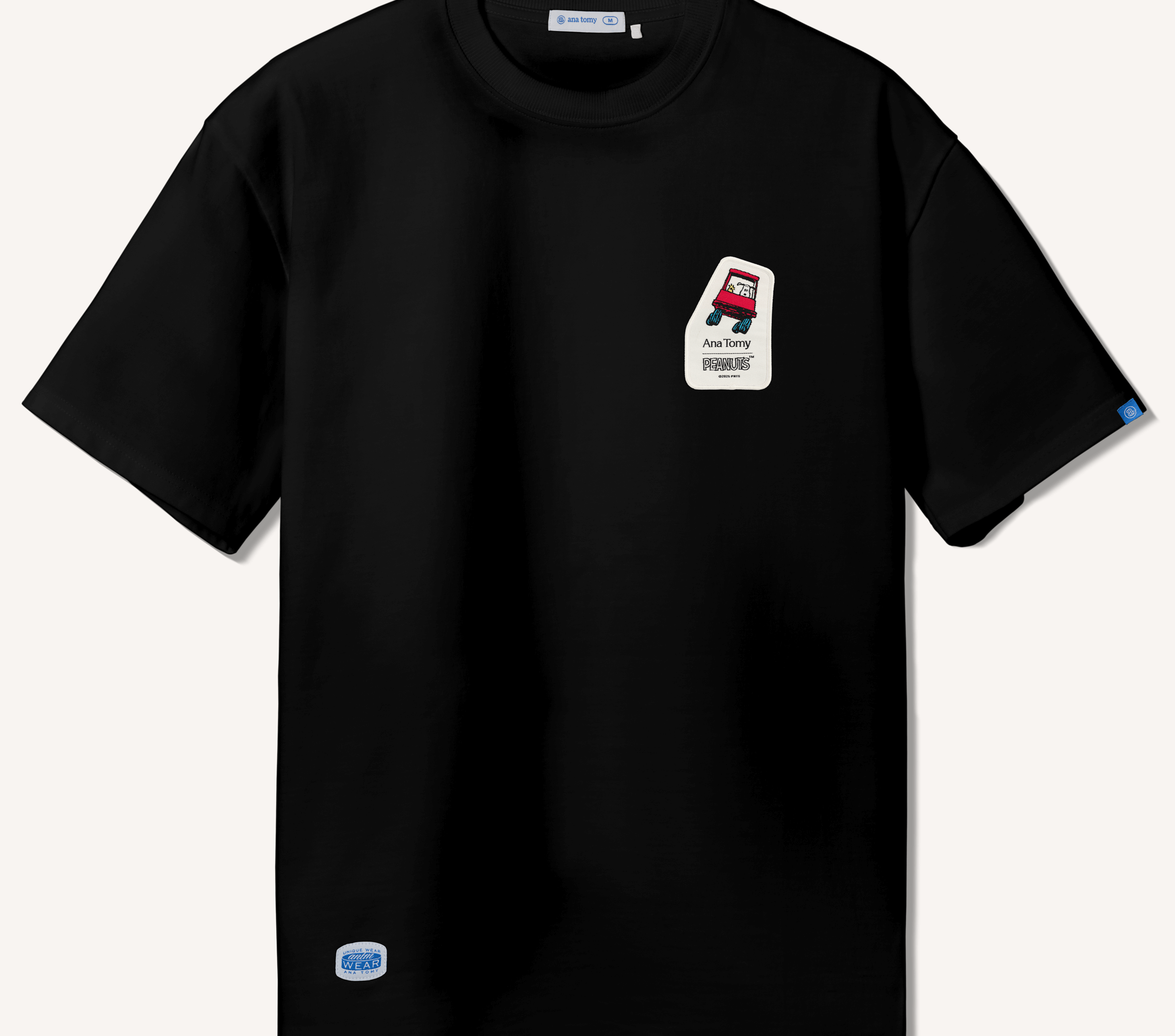 All-new Peanuts™ Tee. A relaxed crew neck made from 280-gram heavy-weight 100% cotton for that soft, durable, everyday comfort. The front features a special embroidered patch of Snoopy and Woodstock cruising in their red cart, while the back showcases a colourful Peanuts™ strip header. Clean fit. Strong character. Perfect for fans who enjoy a little nostalgia stitched into their style.